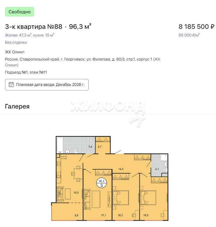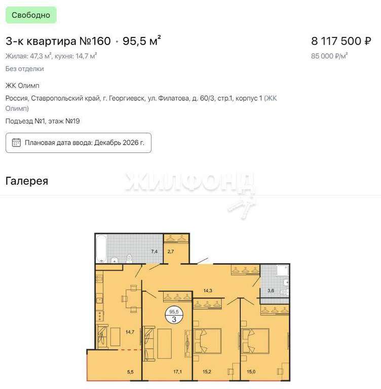 Продаётся просторная трехкомнатная квартира в новом жилом комплексе Олимп.